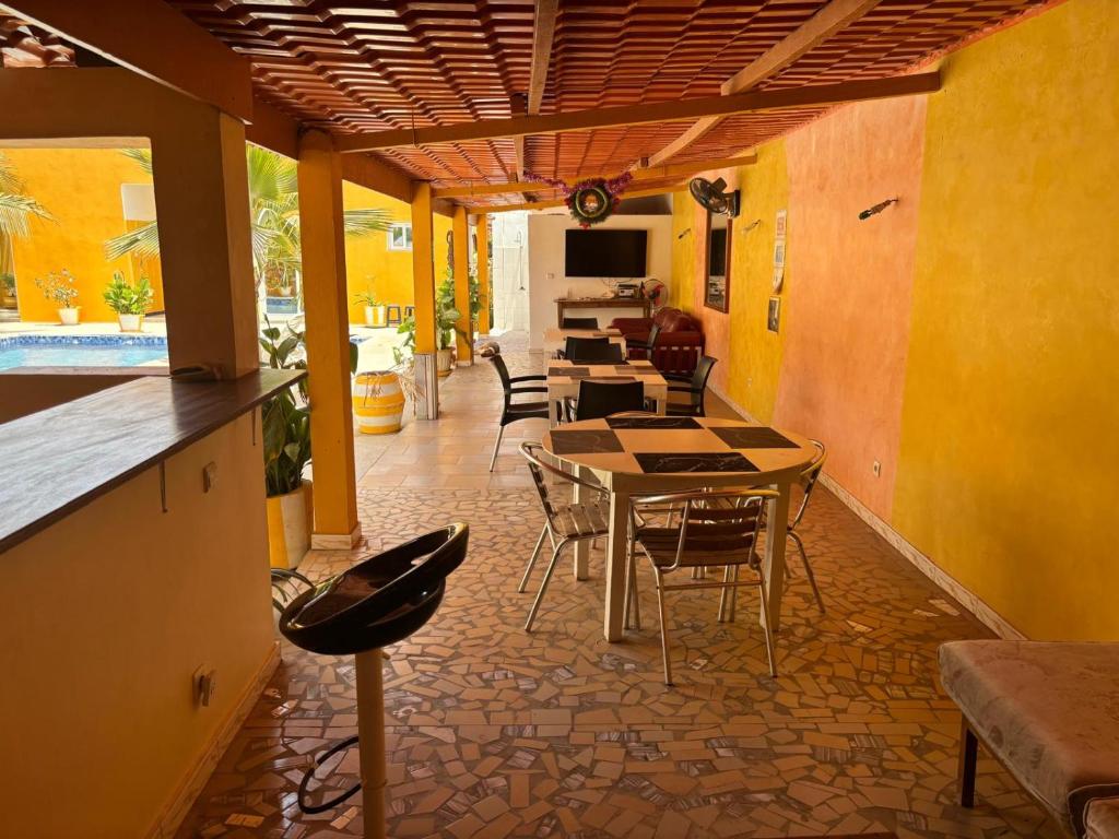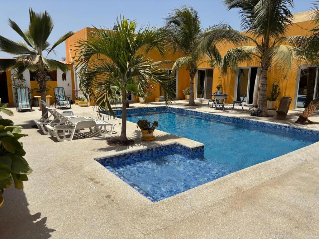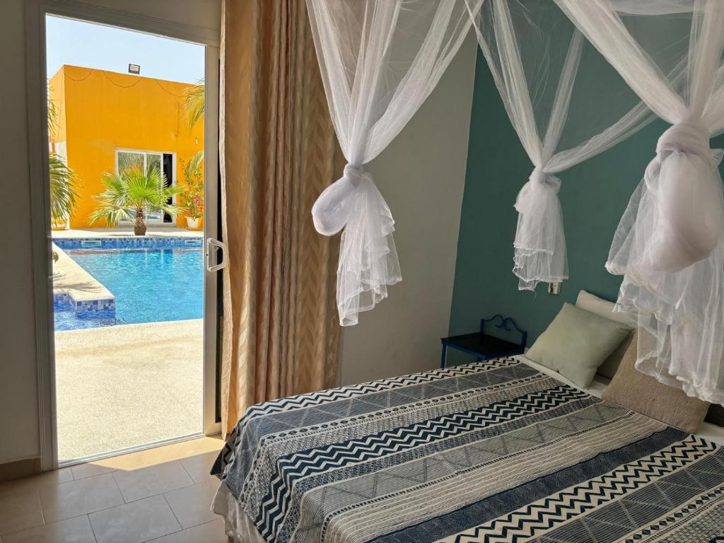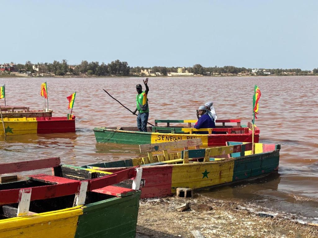 La chambre, décorée dans un style mêlant modernité et touches locales, offre un espace chaleureux et apaisant avec vue sur les environs du Lac Rose. Dès l’entrée, l’atmosphère fraîche de la climatisation vous accueille, assurant un confort optimal quelle que soit la saison.